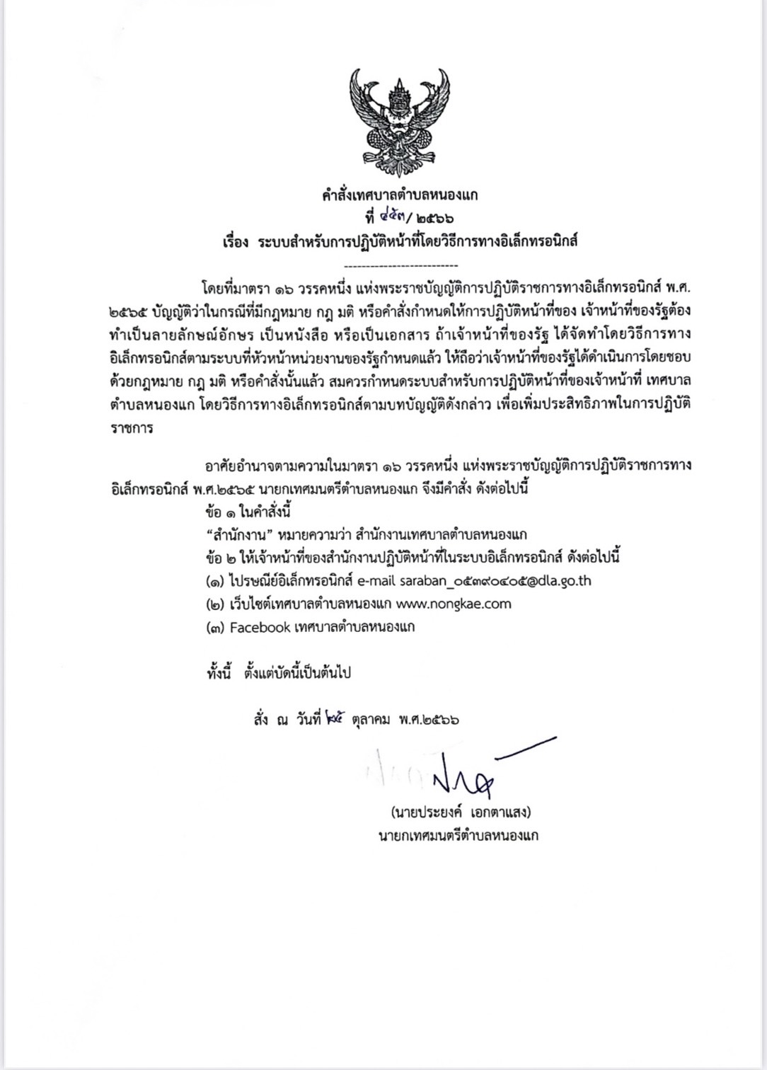 คำสั่งเทศบาลตำบลหนองแก เรื่อง ระบบสำหรับการปฏิบัติหน้าที่โดยวิธีการทางอิเล็กทรอนิกส์