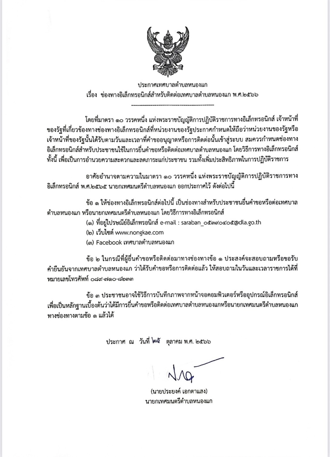 เรื่อง ช่องทางอิเล็กทรอนิกส์สำหรับติดต่อเทศบาลตำบลหนองแก พ.ศ.2566