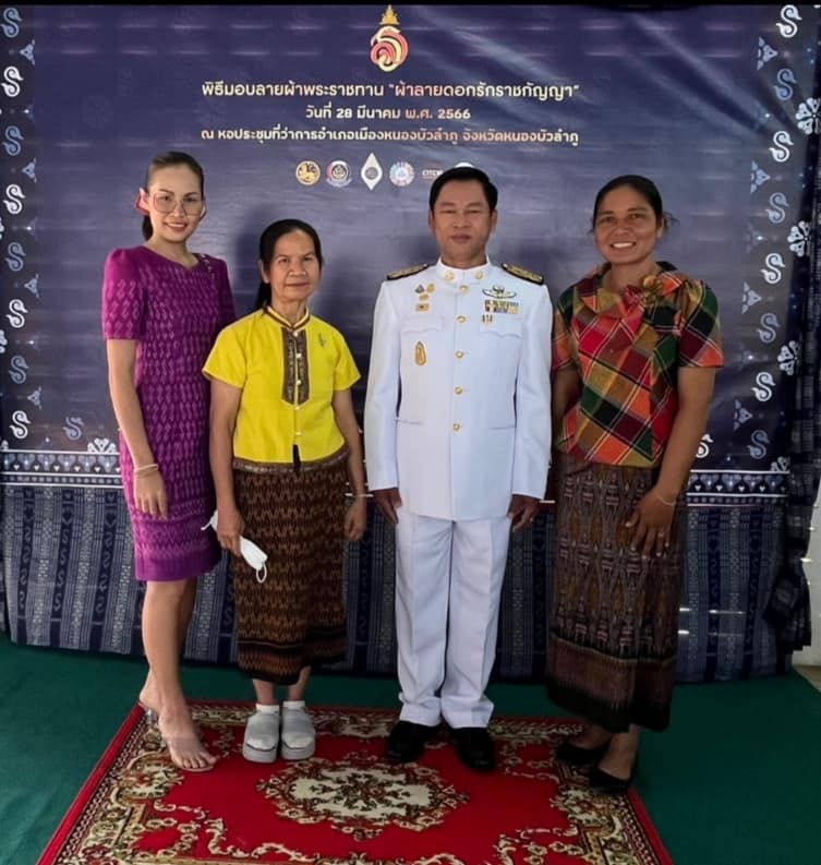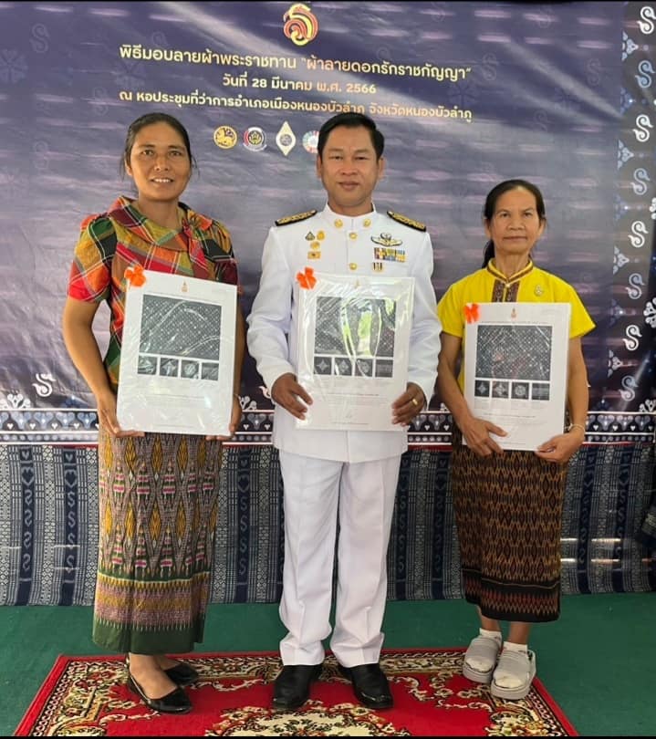 | เนื้อหากิจกรรมโดยย่อ : | วันที่ 28 มีค. 2566 เวลา 08.00 น.นายธนเทพ หาวงษ์ รองนายกเทศมนตรีตำบลหนองแก นางหนูเดือน โคตรหลักคำ ผู้ทอผ้าไหมมัดหมี่ บ้านพุทไธสงค์ ม.9 และ นางไพฑูลย์ ศรีดาหลง กลุ่มเลี้ยงไหมทอผ้าไหม ตำบลหนองแก หมู่ที่ 2 เข้าพิธีรับมอบแบบลายผ้าพระราชทาน "ผ้าลายดอกรักราชกัญญา" ณ หอประชุมที่ว่าการอำเภอเมืองหนองบัวลำภู จังหวัดหนองบัวลำภู | ||
