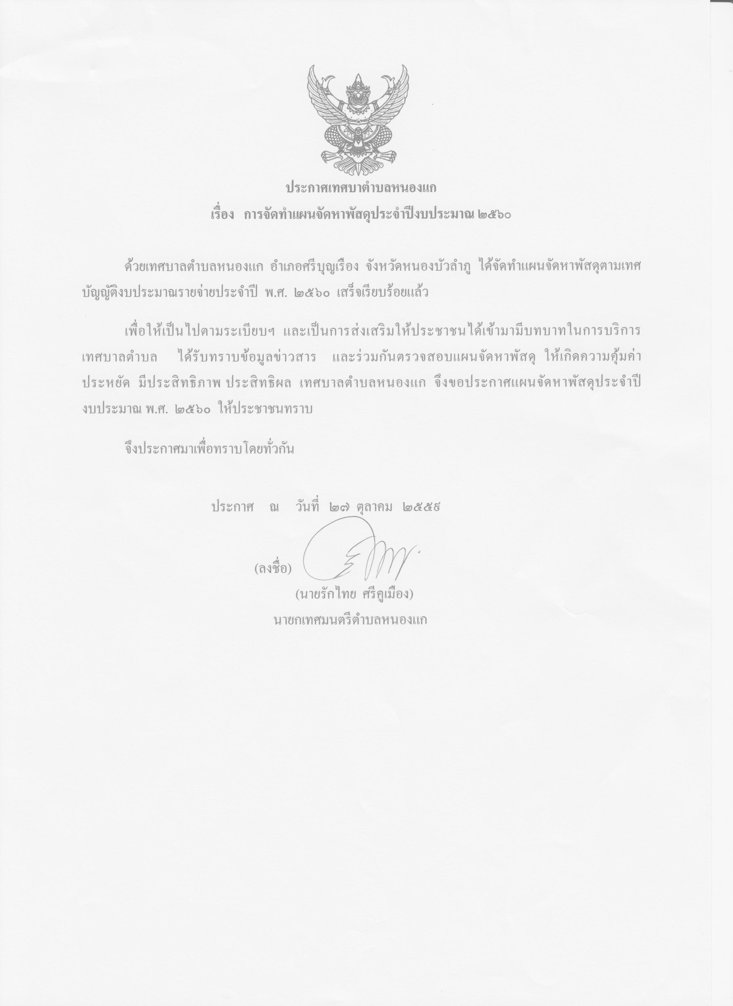 ประกาศเทศบาลตำบลหนองแก เรื่อง การจัดทำแผนจัดหาพัสดุประจำปีงบประมาณ 2560