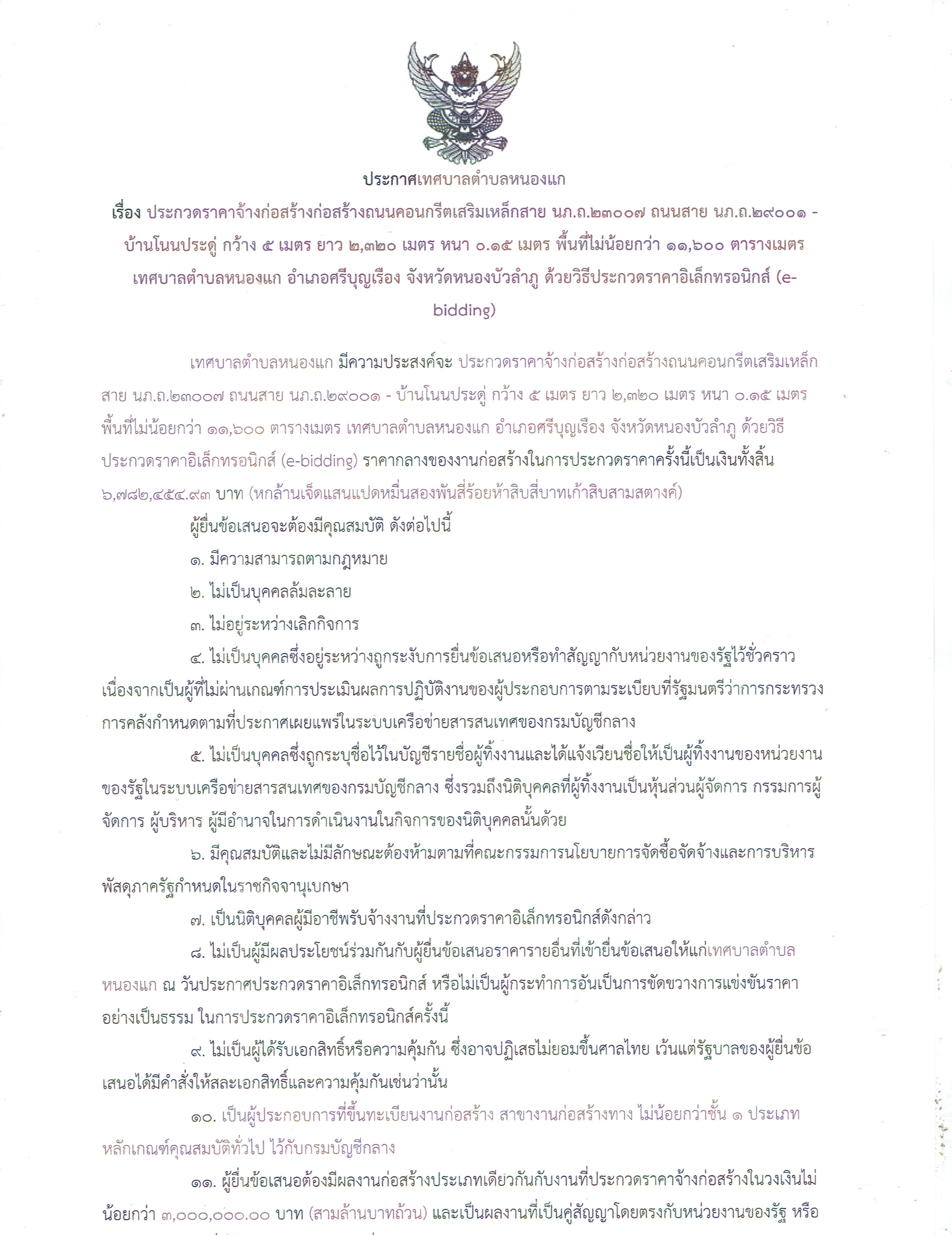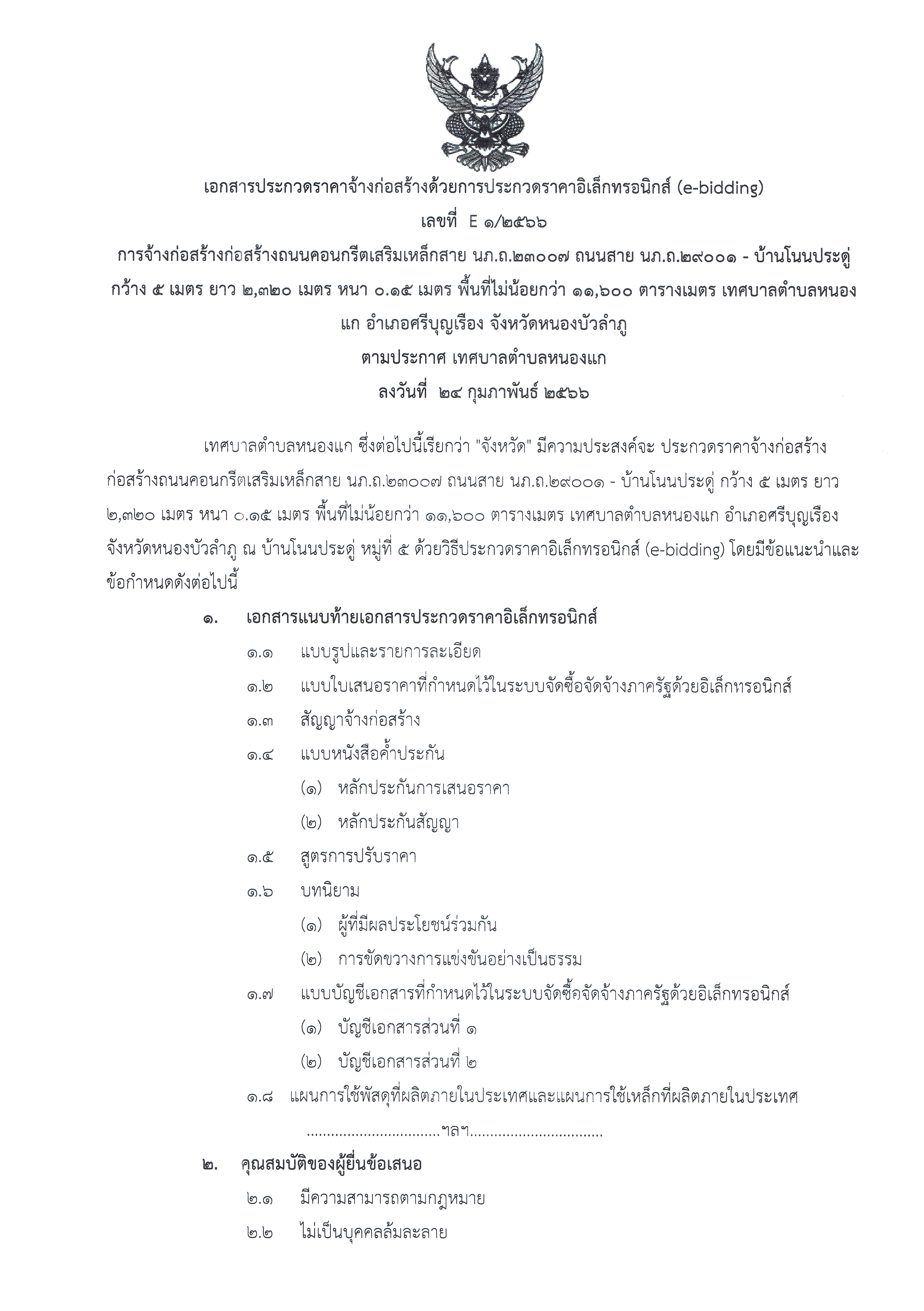 | เนื้อหา : | ประราคาจ้างก่อสร้างก่อสร้างถนนคอนกรีตเสริมเหล็กสาย นภ.ถ23007 ถนนสาย นภ.ถ.29001-บ้านโนนประดู่ กว้าง 5 เมตร ยาว 2,320 เมตร หนา 0.15 เมตร พื้นที่ไม่น้อยกว่า 11,600 ตารางเมตร เทศบาลตำบลหนองแก ตำบลหนองแก อำเภอศรีบุญเรือง จังหวัดหนองบัวลำภู จำนวน 1 โครงการ | ||