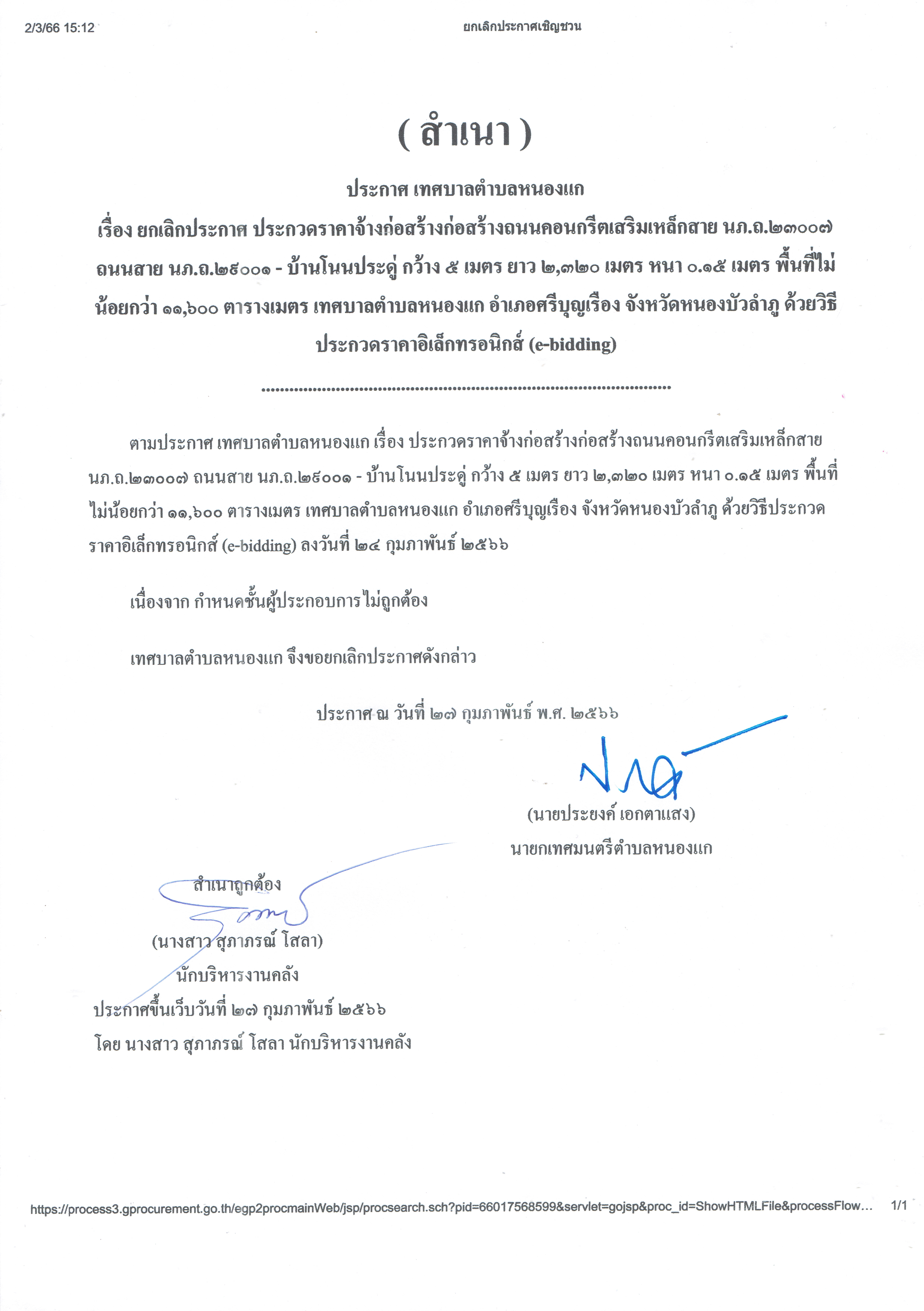 | เนื้อหา : | เทศบาลตำบลหนองแก ขอยกเลิกประกาศ ประกวดราคาจ้างก่อสร้างถนนคอนกรีตเสริมเหล็กสาย นภ.ถ.23007 ถนนสาย นภ..ถ.29001 - บ้านโนนประดู่ กว้าง 5 เมตร ยาว 2,320 เมตร หนา 0.15 เมตร พื้นที่ไม่น้อยกว่า 11,600 ตารางเมตร เทศบาลตำบลหนองแก อำเภอศรีบุญเรือง จังหวัดหนองบัวลำภู (รายละเอียดตามไฟล์แนบ) | ||