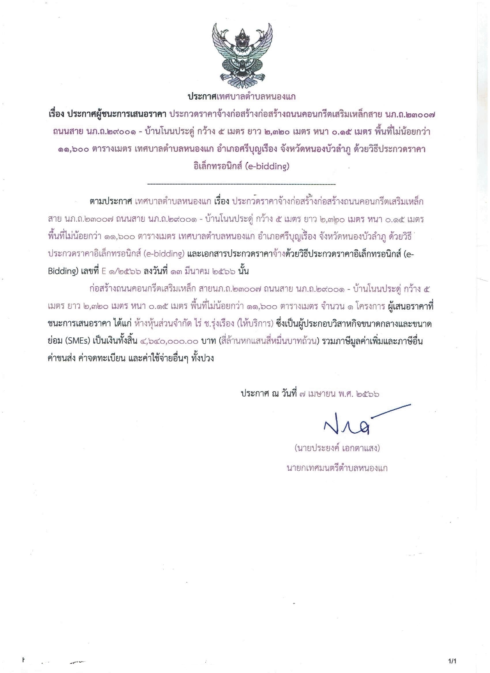 | เนื้อหา : | โครงการก่อสร้างถนนคอนกรีตเสริมเหล็กสาย นภ.ถ.23007 ถนนสาย นภ.ถ.29001-บ้านโนนประดู่ กว้าง 5 เมตร ยาว 2,320 เมตร หนา 0.15 เมตร พื้นที่ไม่น้อยกว่า 11,600 ตารางเมตร เทศบาลตำบลหนองแก อำเภอศรีบุญเรือง จังหวัดหนองบัวลำภู จำนวน 1 โครงการ | ||