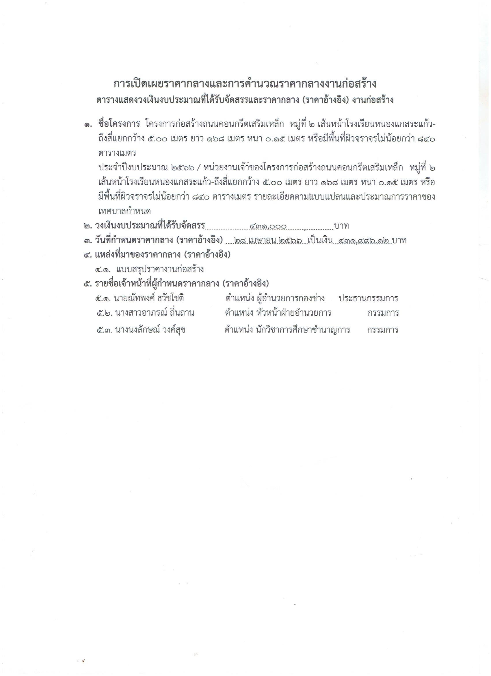 | เนื้อหา : | ประกาศราคากลางโครงการก่อสร้างถนนคอนกรีตเสริมเหล็ก หมู่ที่ 2 สายหน้าโรงเรียนหนองแกสระแก้ววิทยา ถึง สี่แยก ขนาดกว้าง 5.00 เมตร ยาว 168 หนาเฉลี่ย 0.15 เมตร หรือมีพื้นที่ คสล. ไม่น้อยกว่า 480 ตารางเมตร | ||