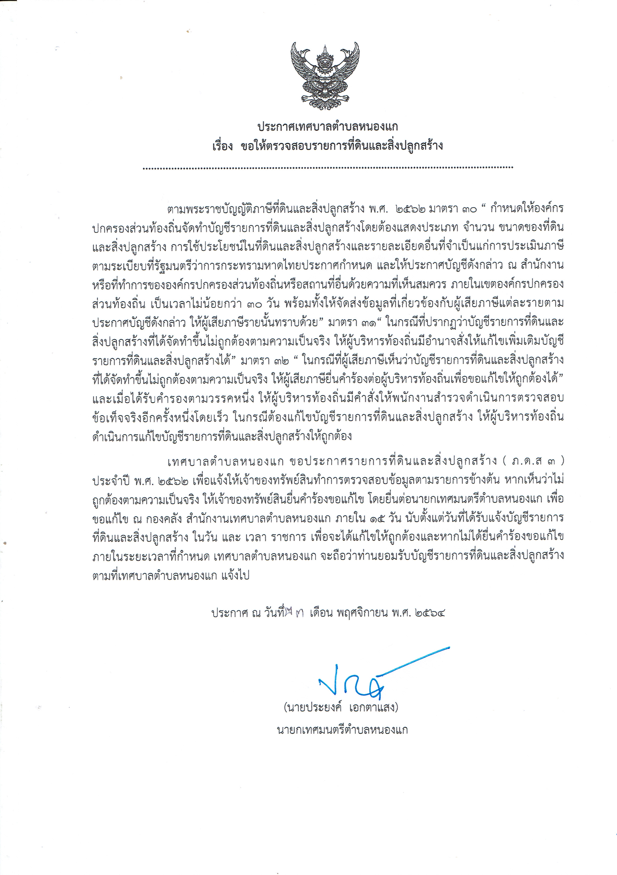 ประกาศให้ตรวจสอบรายการที่ดินและสิ่งปลูกสร้าง