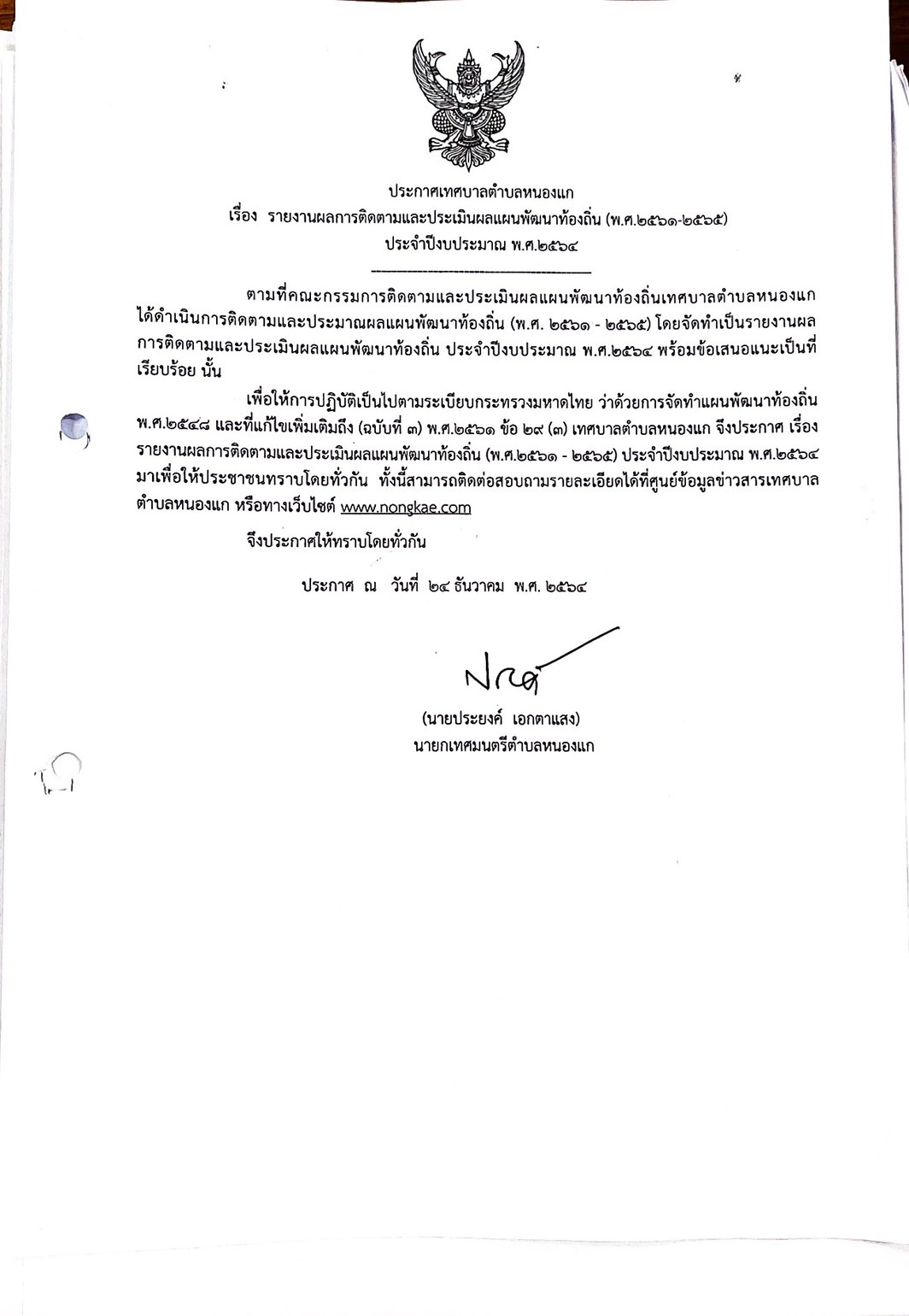 ประกสศเทศบาลตำบลหนองแก เรื่อง รายงานผลการติดตามและประเมินผลแผนพัมนาท้องถิ่น (พ.ศ.2561-2565 ประจำปีงบประมาณ พ.ศ.2564