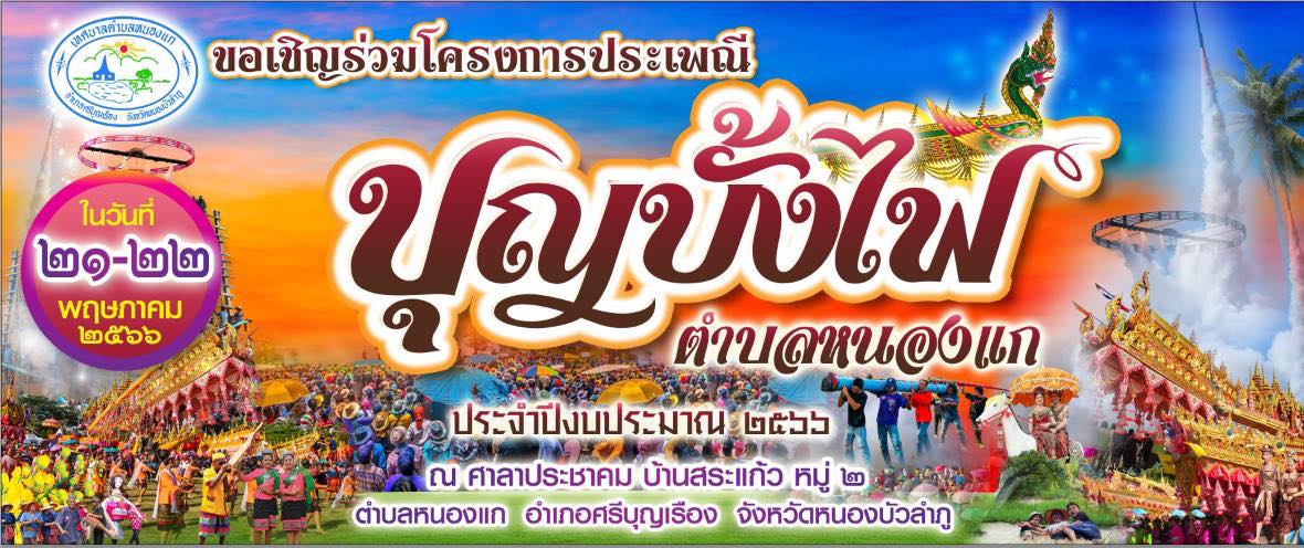 | เนื้อหาประชาสัมพันธ์ : | ขอเชิญร่วมโครงการประเพณีบุญบั้งไฟตำบลหนองแก ประจำปีงบประมาณ 2566 ณ ศาลาประชาคมบ้านสระแก้ว หมู่ 2 ต.หนองแก อ.ศรีบุญเรือง จ.หนองบัวลำภู ในวันที่ 21-22 พฤษภาคม 2566 | ||