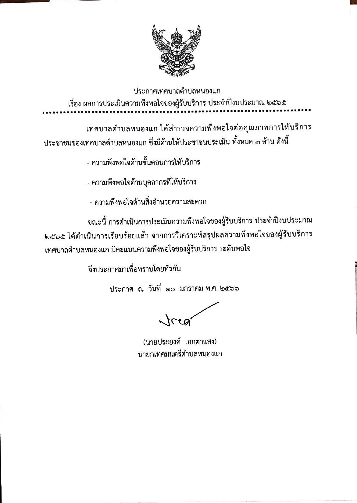 ประกาศเทศบาลตำบลหนองแก ผลการประเมินความพึงพอใจของผู้รับบริการ ประจำปีงบประมาณ 2565