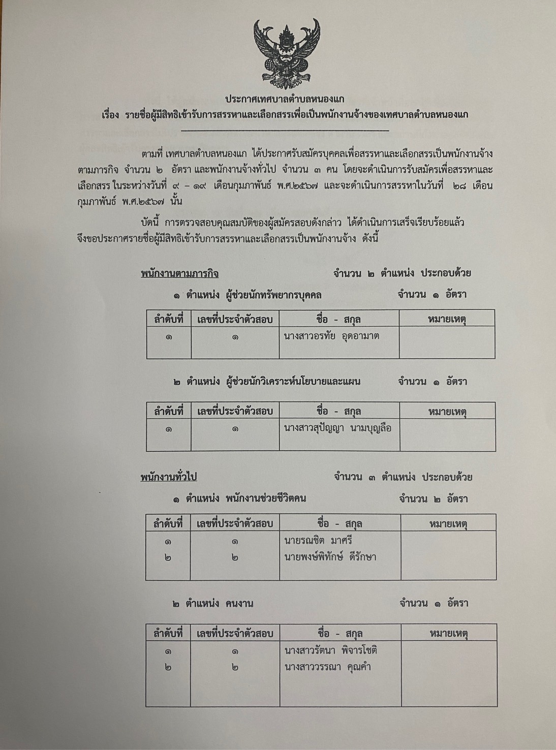 ประกาศรายชื่อผู้มีสิทธิเข้ารับการสรรหาและเลือกสรรเป็นพนักงานจ้างตามภารกิจและพนักงานจ้างทั่วไป