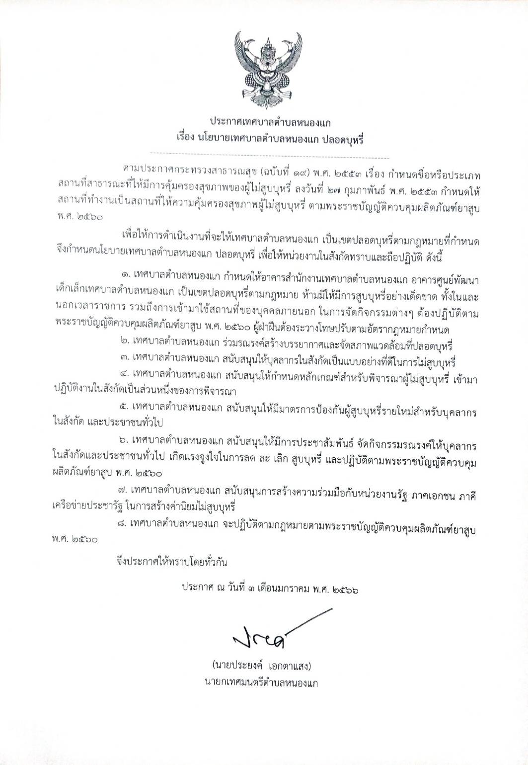 เรื่อง นโยบายเทศบาลตำบลหนองแก ปลอดบุหรี่