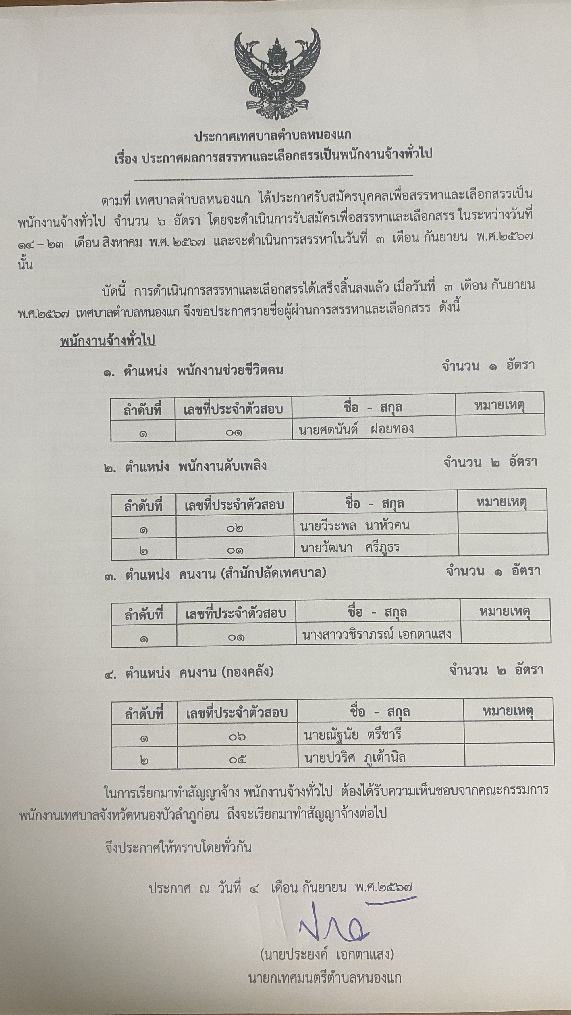 ประกาศผลการสรรหาและเลือกสรรบุคคลเป็นพนักงานจ้างทั่วไป