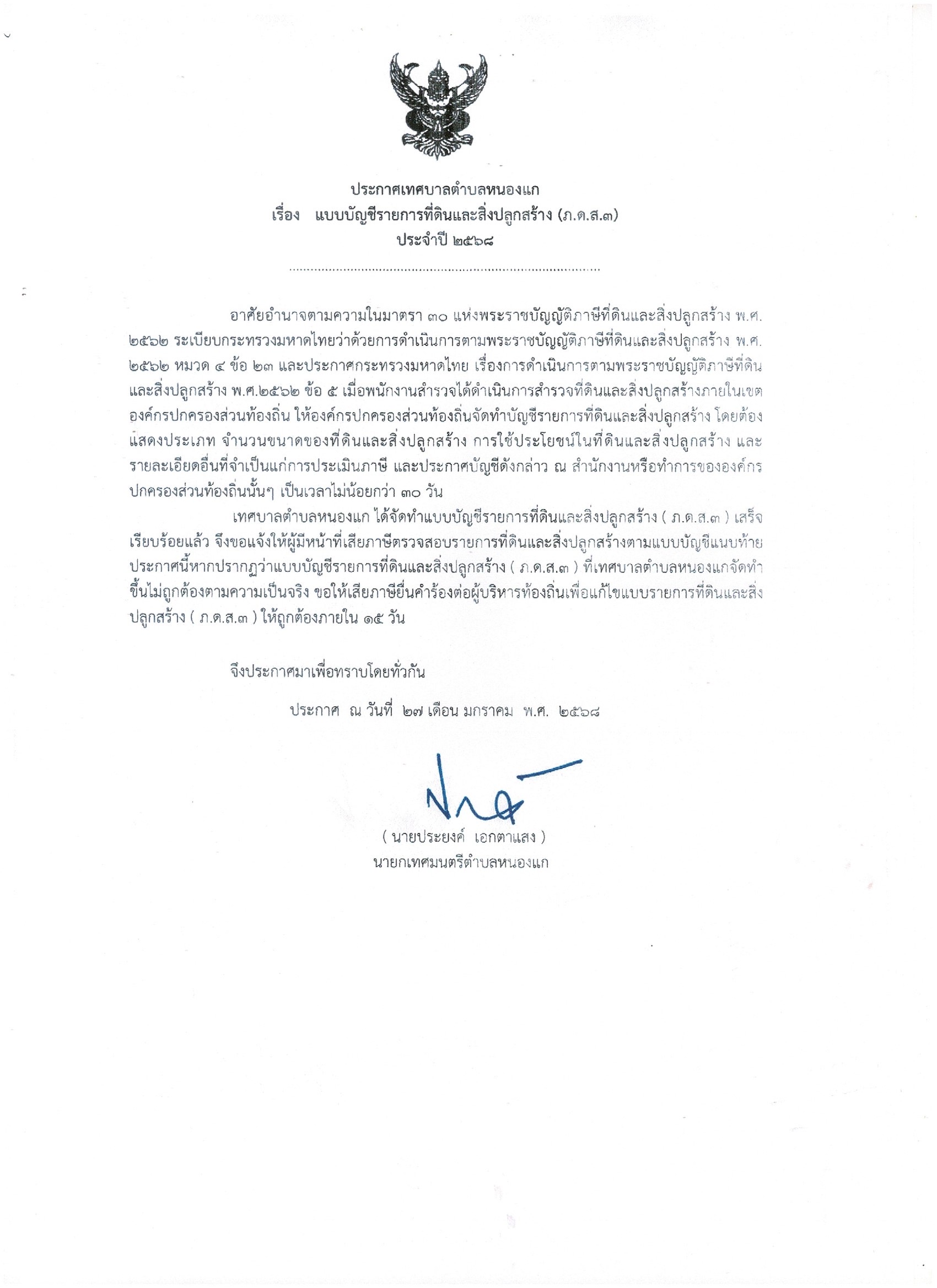 ประกาศเทศบาลตำบลหนองแก แบบบัญชีรายการที่ดินและสิ่งปลูกสร้าง (ภ.ด.ส.3) ประจำปี 2568