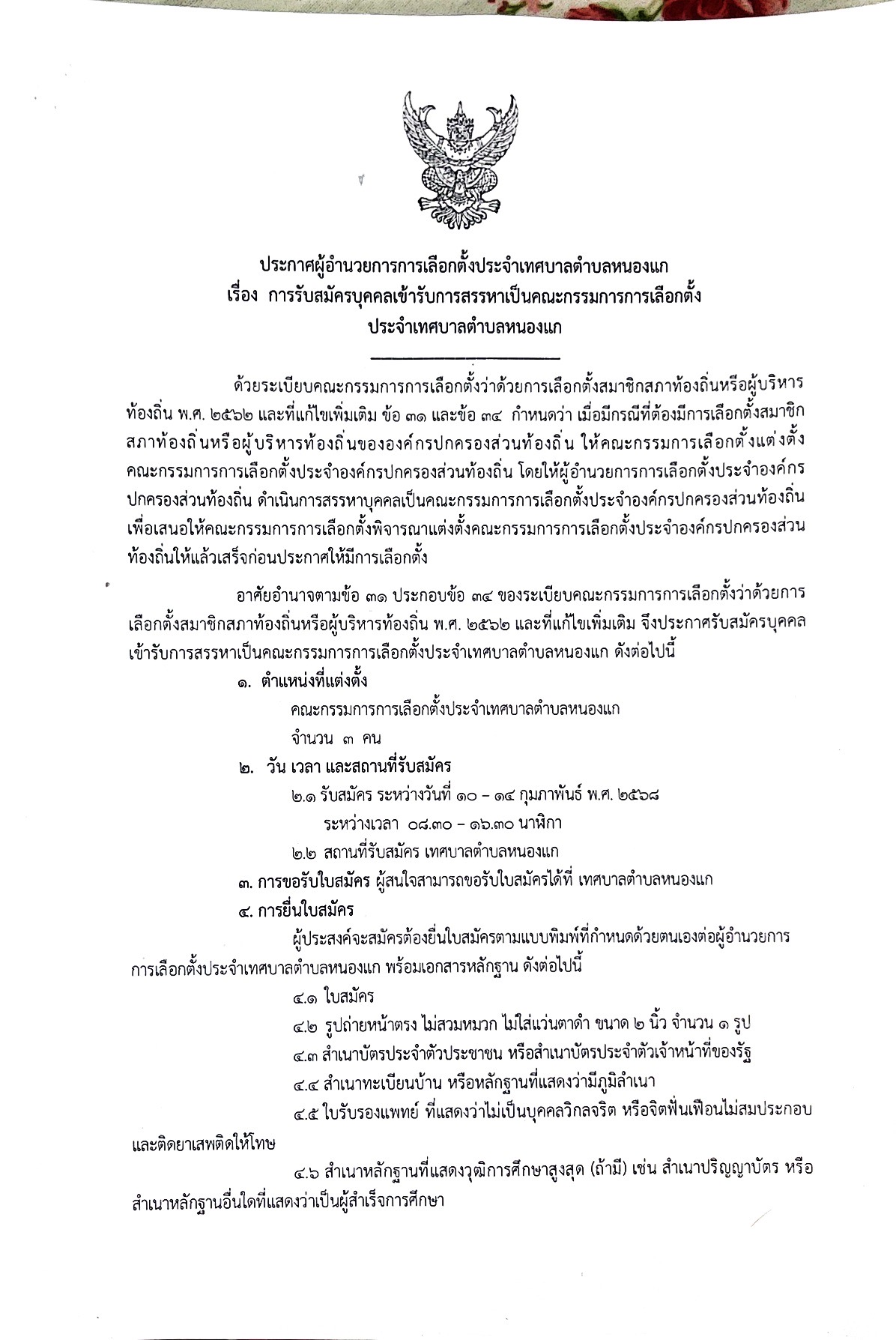 เรื่อง การรับสมัครบุคคลเข้ารับการสรรหาเป็นคณะกรรมการ การเลือกตั้ง ประจำเทศบาลตำบลหนองแก