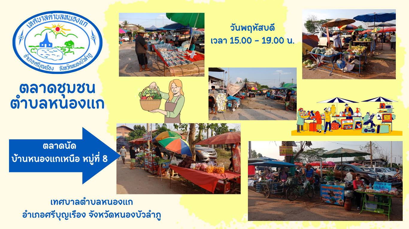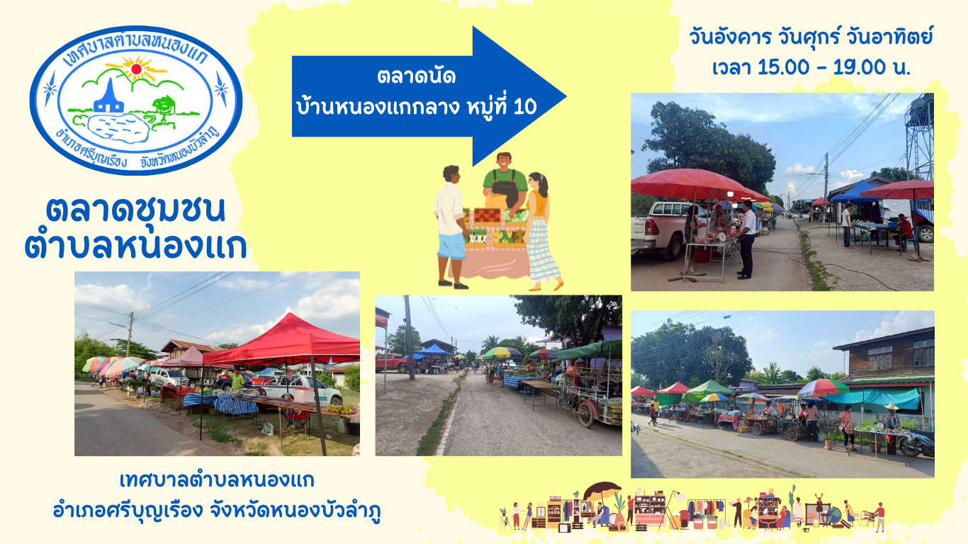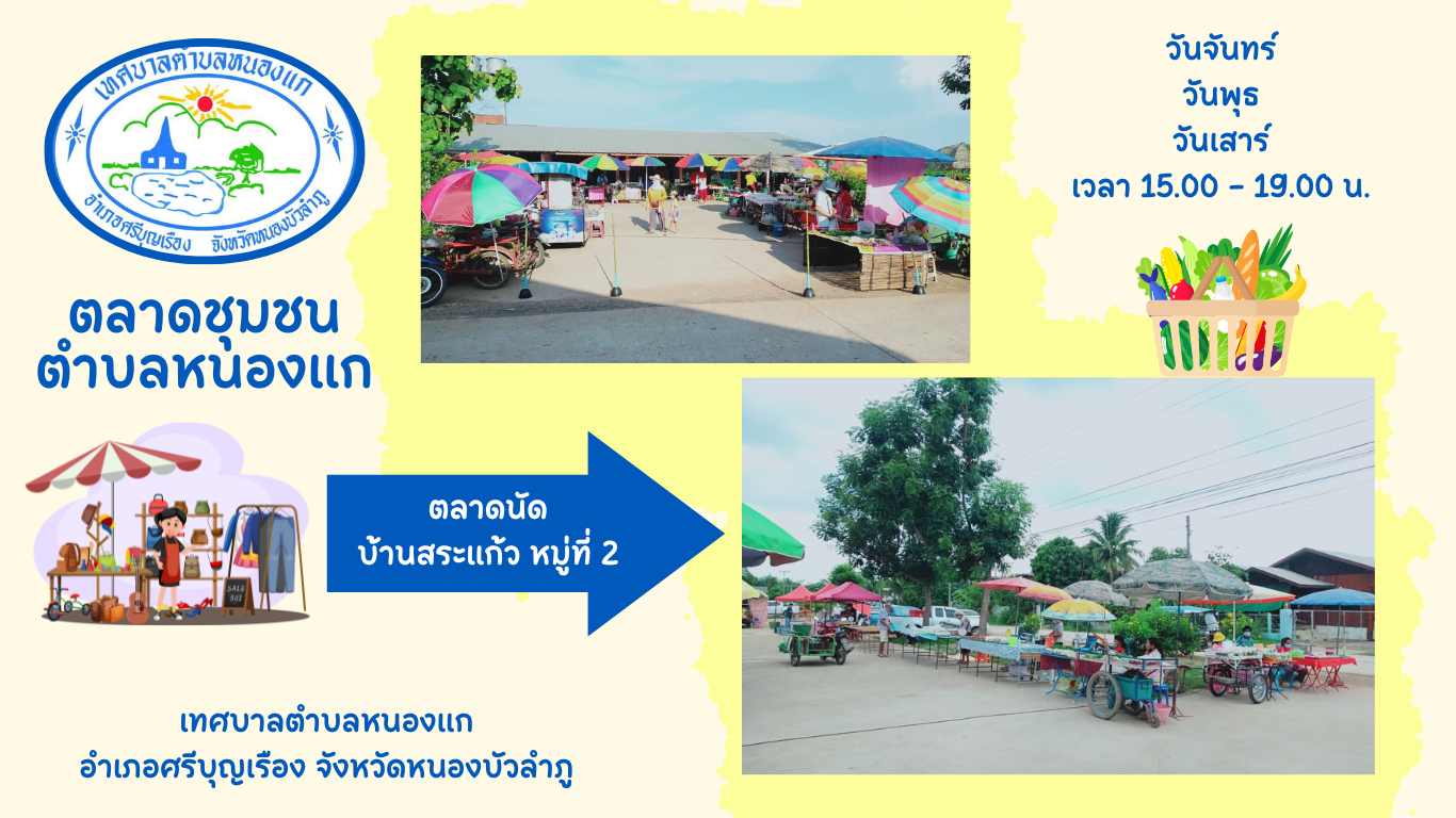 เทศบาลตำบลหนองแก ขอเชิญชวนประชาชนตำบลหนองแก ร่วมอุดหนุนสินค้าทางการเกษตร (กลุ่มเกษตรอินทรีย์) และสินค้าอื่นๆ มากมาย เพื่อกระตุ้นเศรษฐกิจและส่งเสริมกลุ่มอาชีพในชุมชนตำบลหนองแก ณ ตลาดนัดชุมชนตำบลหนองแก ทุกวัน เวลา 15.00 - 19.00 น. ตามตาราง