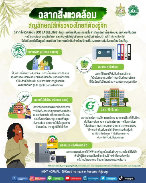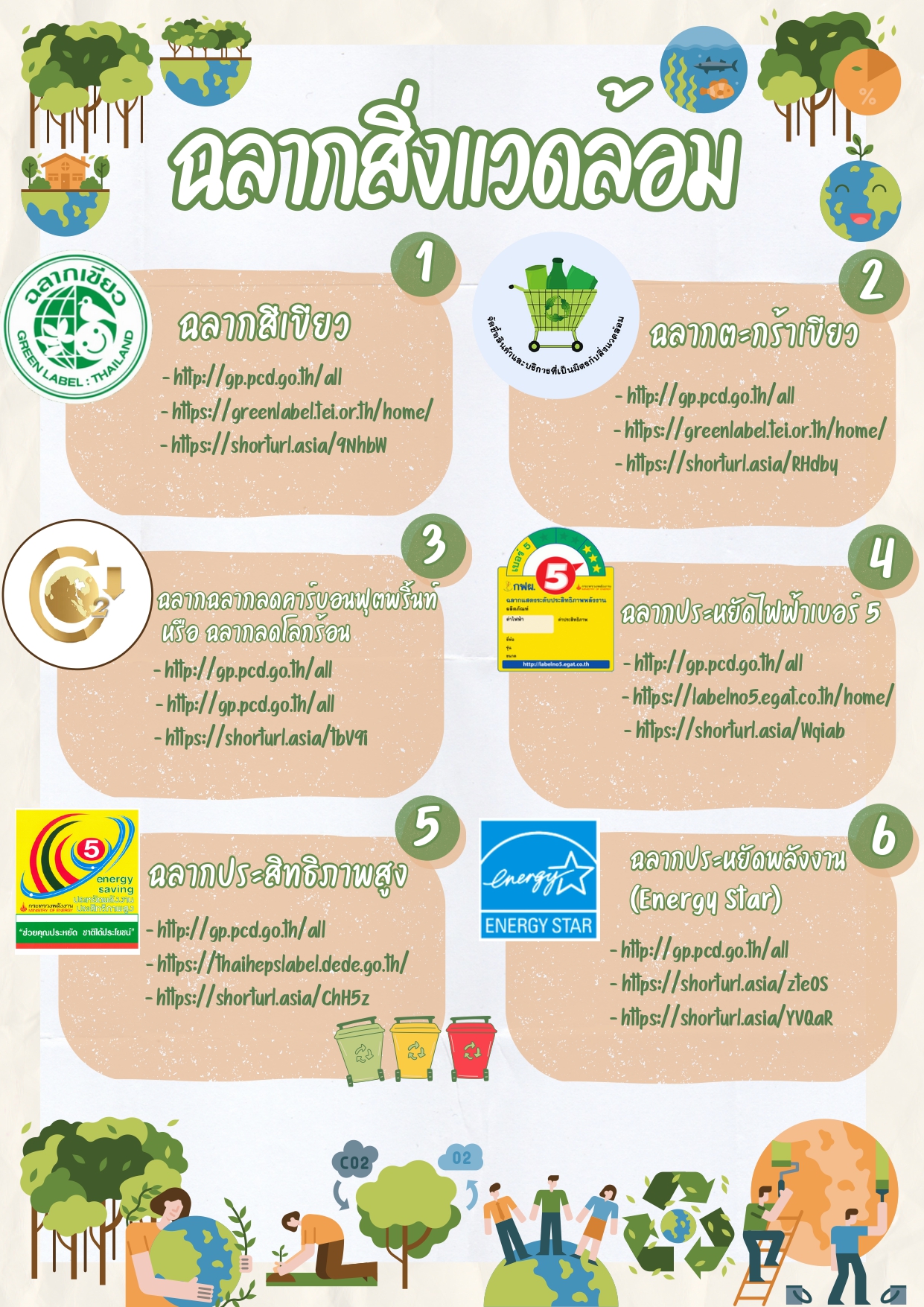 ฉลากสิ่งแวดล้อม (ECO LABELLING) ในประเทศไทยเป็นกลไกการสื่อสารที่ถูกจัดทำขึ้น เพื่อบ่งบอกความเป็นมิตรต่อสิ่งแวดล้อมของผลิตภัณฑ์ และเพื่อจูงใจให้ผู้บริโภคทราบว่าสินค้าหรือบริการที่กำลังจะเลือกใช้ มีส่วนในการใส่ใจดูแลสิ่งแวดล้อม โดยการผลิตสินค้าหรือบริการที่ส่งผลกระทบกับสิ่งแวดล้อมน้อยที่สุด . 1. ฉลากเขียว (Green Label) เป็นฉลากที่แสดงว่า สินค้าและบริการนั้นได้ผ่านการประเมินและตรวจสอบด้านผลกระทบต่อสิ่งแวดล้อมจากองค์กรอิสระที่ไม่มีส่วนได้ส่วนเสีย ซึ่งพิจารณาจากวัฏจักรชีวิตของผลิตภัณฑ์ (Life Cycle Consideration) . 2. ฉลากตะกร้าเขียว ฉลากที่รับรองและให้กับสินค้าและบริการ ที่เป็นไปตามเกณฑ์ข้อกำหนดสินค้าและบริการที่เป็นมิตรกับสิ่งแวดล้อม ของกรมควบคุมมลพิษ . 3. ฉลากใบไม้เขียว (Green Leaf) ฉลากรับรองการพัฒนาประสิทธิภาพการใช้พลังงานและคุณภาพสิ่งแวดล้อมของธุรกิจการท่องเที่ยวและการโรงแรม รวมถึงการพัฒนาบุคลากรเพื่อดูแลสิ่งแวดล้อม และความใส่ใจในคุณภาพสิ่งแวดล้อม จากมูลนิธิใบไม้เขียว . 4. ฉลาก G-Green ฉลากส่งเสริมการผลิต การบริการ และการบริโภคที่เป็นมิตรกับสิ่งแวดล้อม ของกรมส่งเสริมคุณภาพสิ่งแวดล้อม ที่ส่งเสริมสถานประกอบการขนาดกลางและขนาดย่อม ให้ความสำคัญกับการใช้ทรัพยากรอย่างคุ้มค่าและมีประสิทธิภาพ คำนึงถึงผลกระทบที่จะเกิดขึ้นกับสิ่งแวดล้อม . 5. ฉลากประหยัดไฟเบอร์ 5 ฉลากแสดงระดับการใช้ไฟฟ้าและข้อมูลเบื้องต้นต่างๆ ของเครื่องใช้ไฟฟ้า เพื่อให้ผู้ใช้สามารถเลือกซื้อเครื่องใช้ไฟฟ้าที่ช่วยประหยัดพลังงานในระยะยาว ซึ่งออกโดยกระทรวงพลังงาน