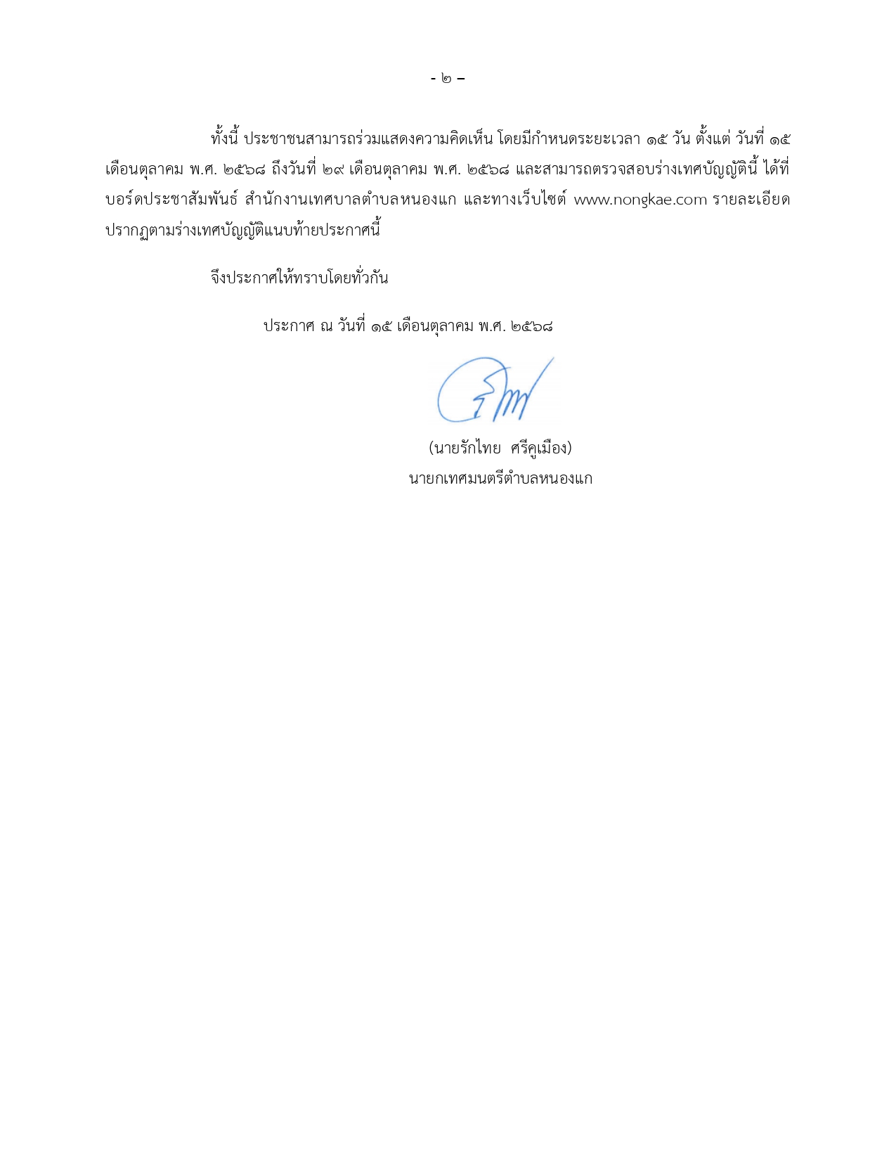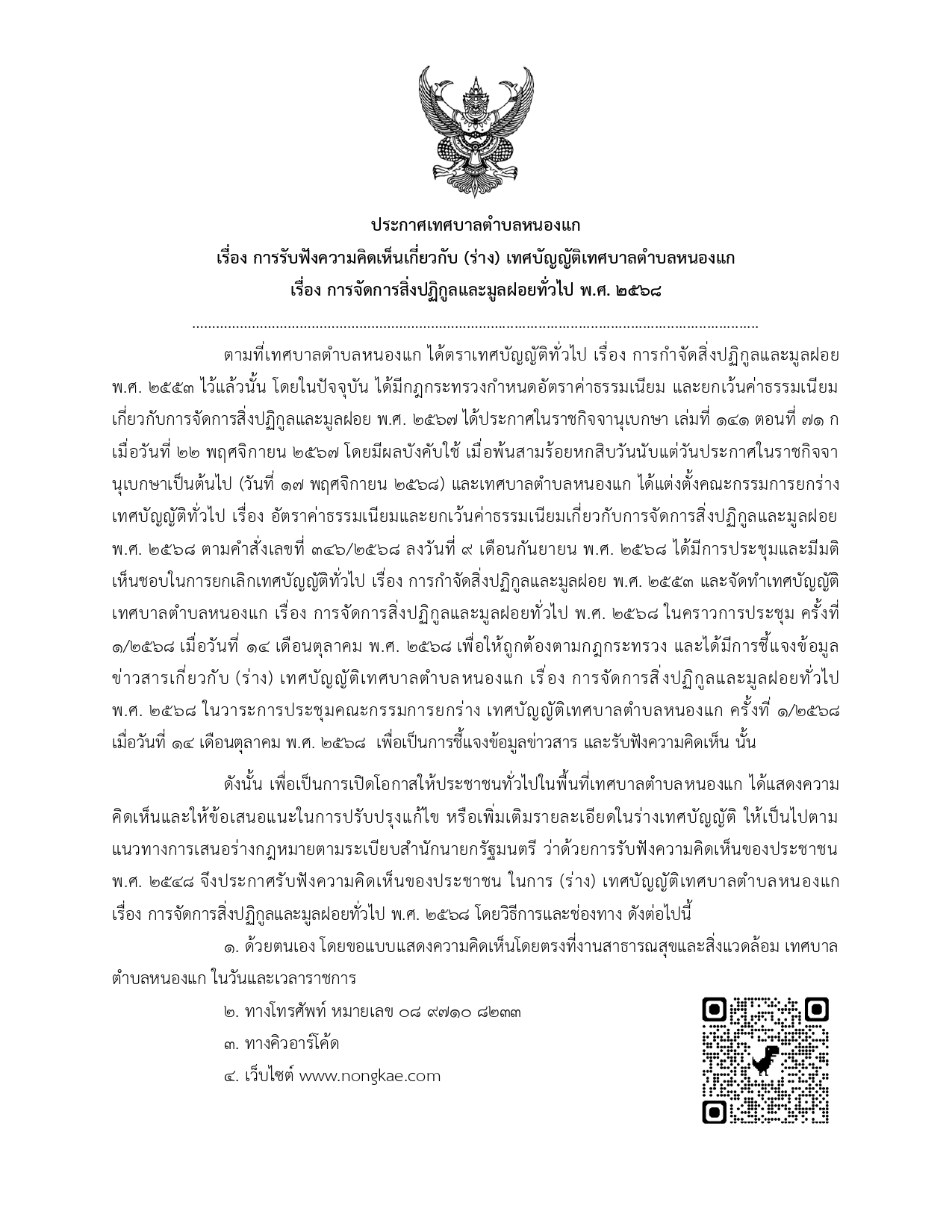ประกาศเทศบาลตำบลหนองแก เรื่อง การรับฟังความคิดเห็นเกี่ยวกับ (ร่าง) เทศบัญญัติเทศบาลตำบลหนองแก เรื่อง การจัดการสิ่งปฏิกูลและมูลฝอยทั่วไป พ.ศ. 2568 |