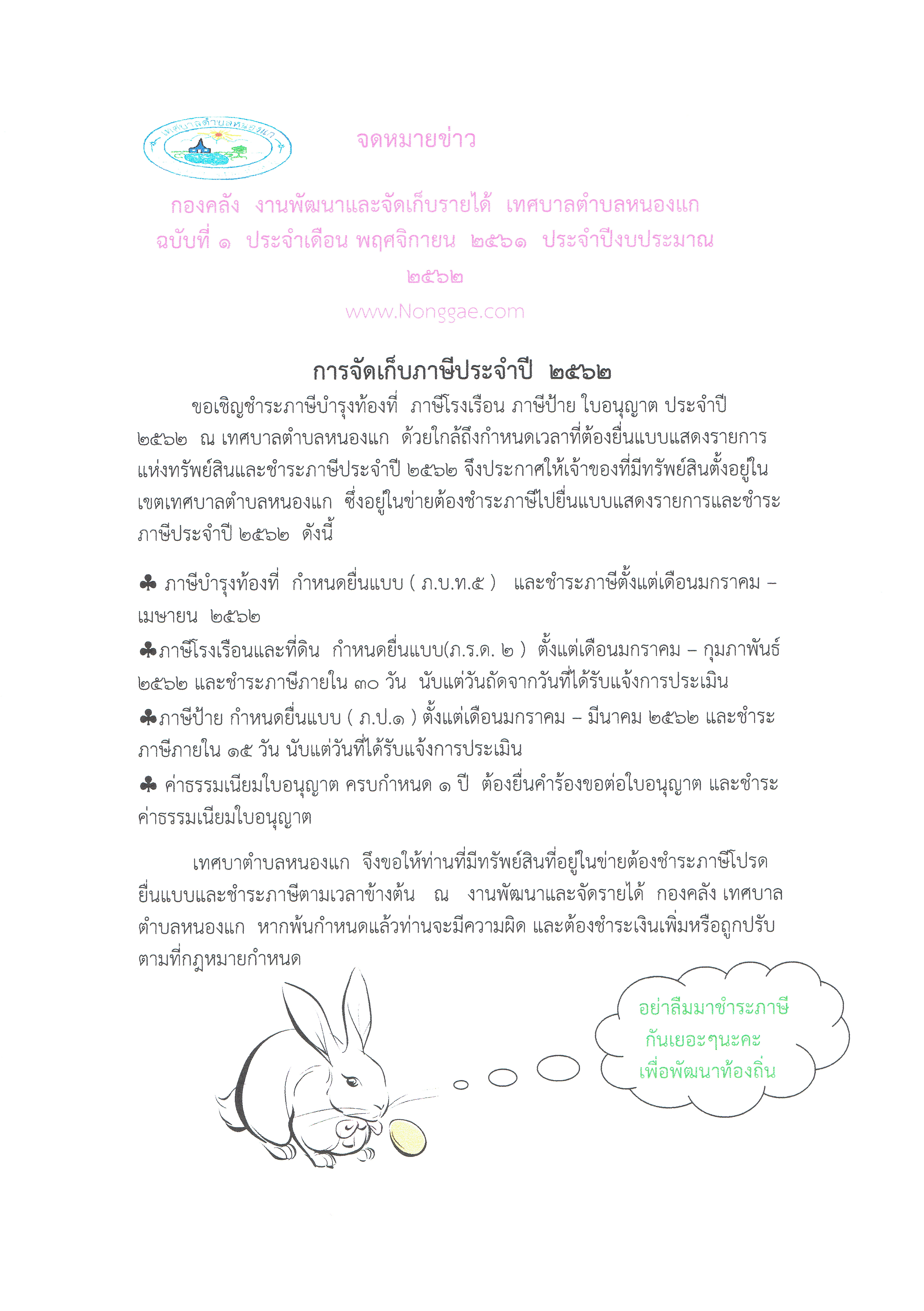 ขอเชิญผู้มีทรัพย์สินที่ตั้งอยู่ในเขตเทศบาลตำบลหนองแก ชำระภาษีบำรุงท้องที่ ภาษีป้าย ภาษีโรงเรือนและที่ดิน และค่าธรรมเนียมใบอนุญาต ประจำปี 2562 ณ กองคลัง เทศบาลตำบลหนองแก 1) ภาษีบำรุงท้องที่ ชำระภาษีตั้งแต่ เดือน มกราคม- เมษายน 2562 2) ภาษีโรงเรือนและที่ดิน ชำระภาษีตั้งแต่ มกราคม - กุมภาพันธ์ 2562 3) ภาษีป้าย ชำระภาษี ตั้งแต่ มกราคม - มีนาคม 2562 4) ค่าธรรมเนียมใบอนุญาต ครบกำหนด 1 ปี ต้องยื่นคำร้องและชำระค่าธรรมเนียม