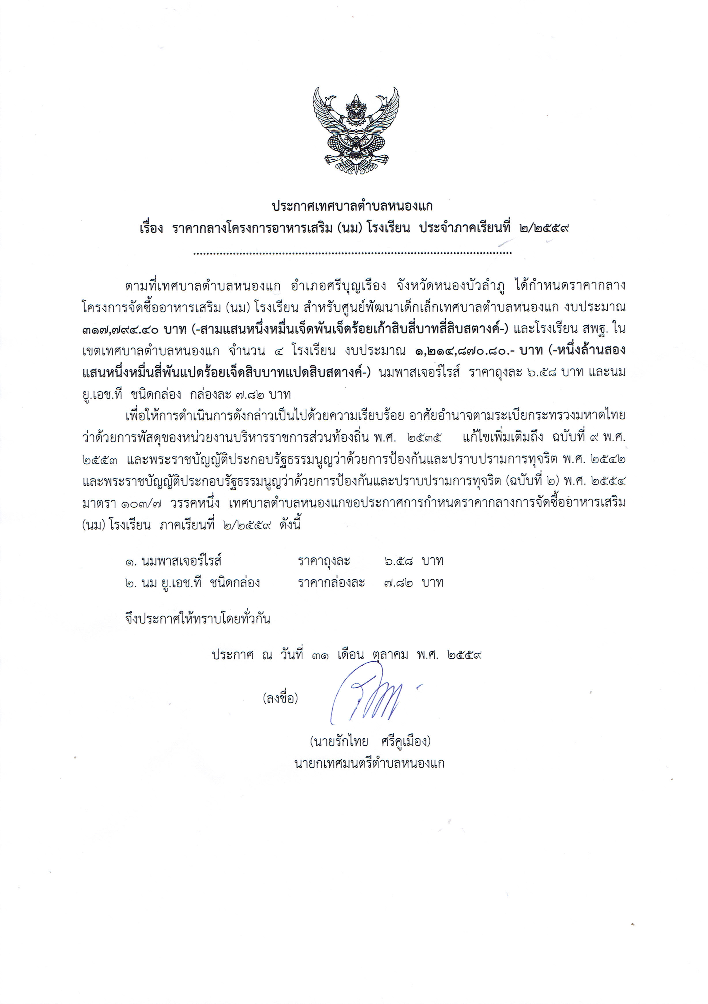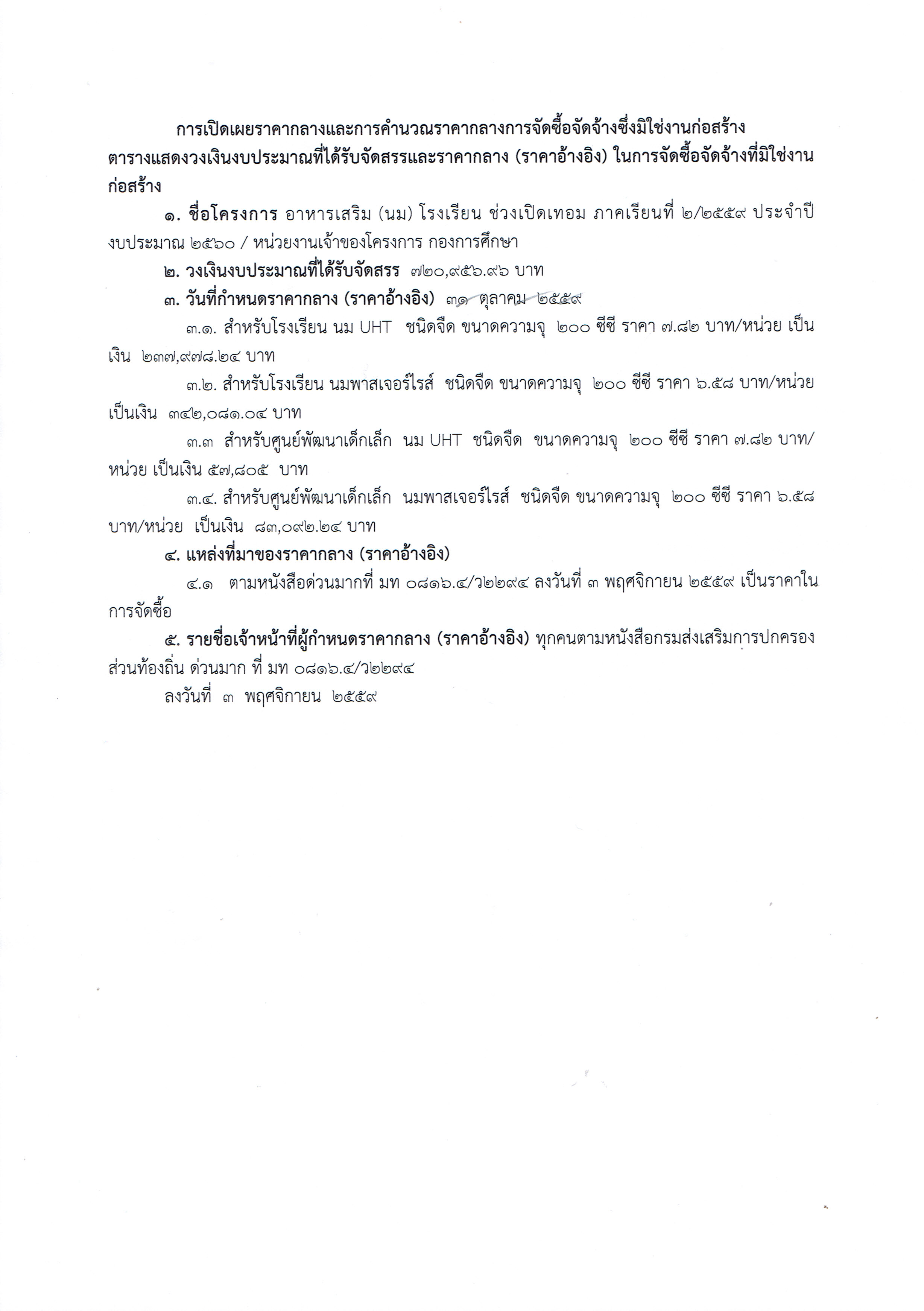 ราคากลางโครงการอาหารเสิรม (นม) โรงเรียน ประจำภาคเรียนที่ 2/2559