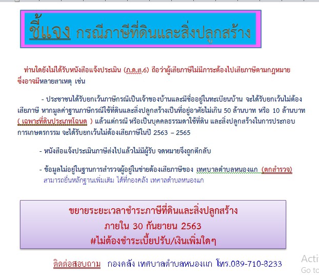 เทศบาลตำบลหนองแก ขอประชาสัมพันธ์ ขยายระยะเวลาชำระภาษีที่ดินและสิ่งปลูกสร้าง ประจำปี 2563 ตามเอกสารแนบ