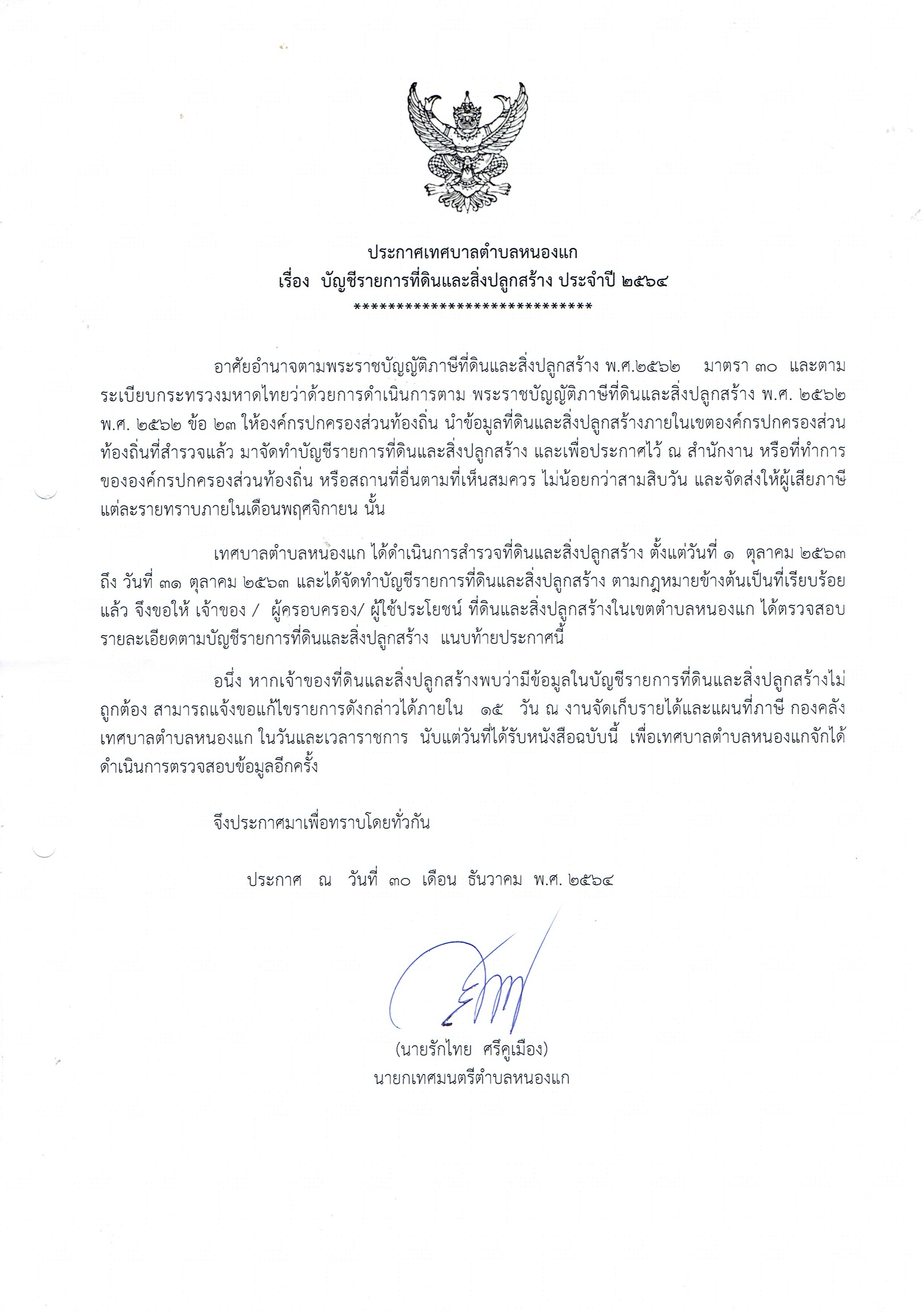 บัญชีรายการที่ดินและสิ่งปลูกสร้าง ประจำปี 2564