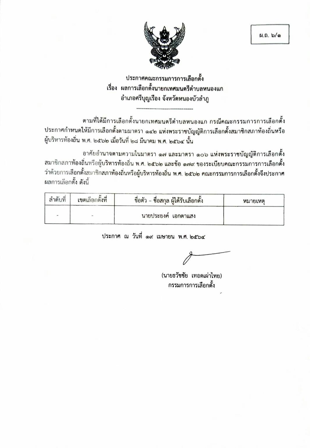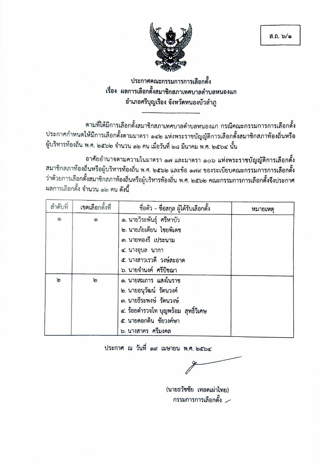 อาศัยอำนาจตามความในมาตรา ๑๗ และมาตรา ๑๐๖ แห่งพระราชบัญญัติการเลือกตั้งสมาชิกสภาท้องถิ่่นหรือผู้บริหารท้องถิ่น พ.ศ.๒๕๖๒ และข้อ ๑๗๙ ของระเบียบคณะกรรมการการเลือกตั้งว่าด้วยการเลือกตั้งสมาชิกสภาท้องถิ่นหรือผู้บริหารท้องถิ่น พ.ศ.๒๕๖๒ คณะกรรมการการเลือกตั้งจึงประกาศผลการเลือกตั้งดังนี้