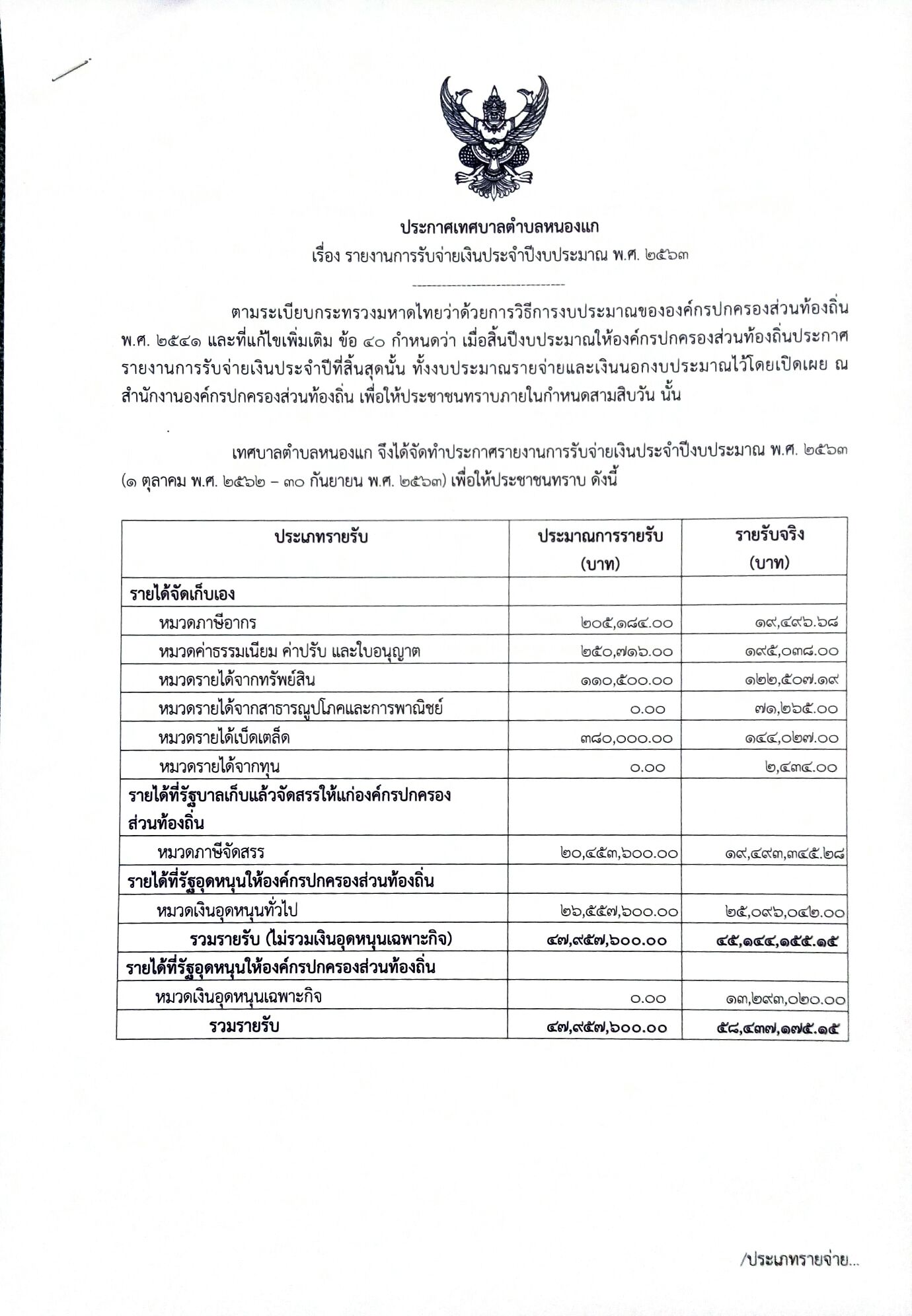 เรื่อง รายงานการรับจ่ายเงินประจำปีงบประมาณ พ.ศ. 2563
