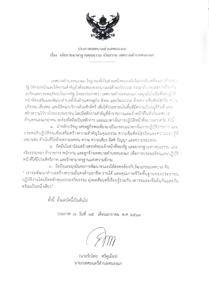 เรื่อง นโยบายมาตรฐานคุณธรรม จริยธรรม เทศบาลตำบลหนองแก